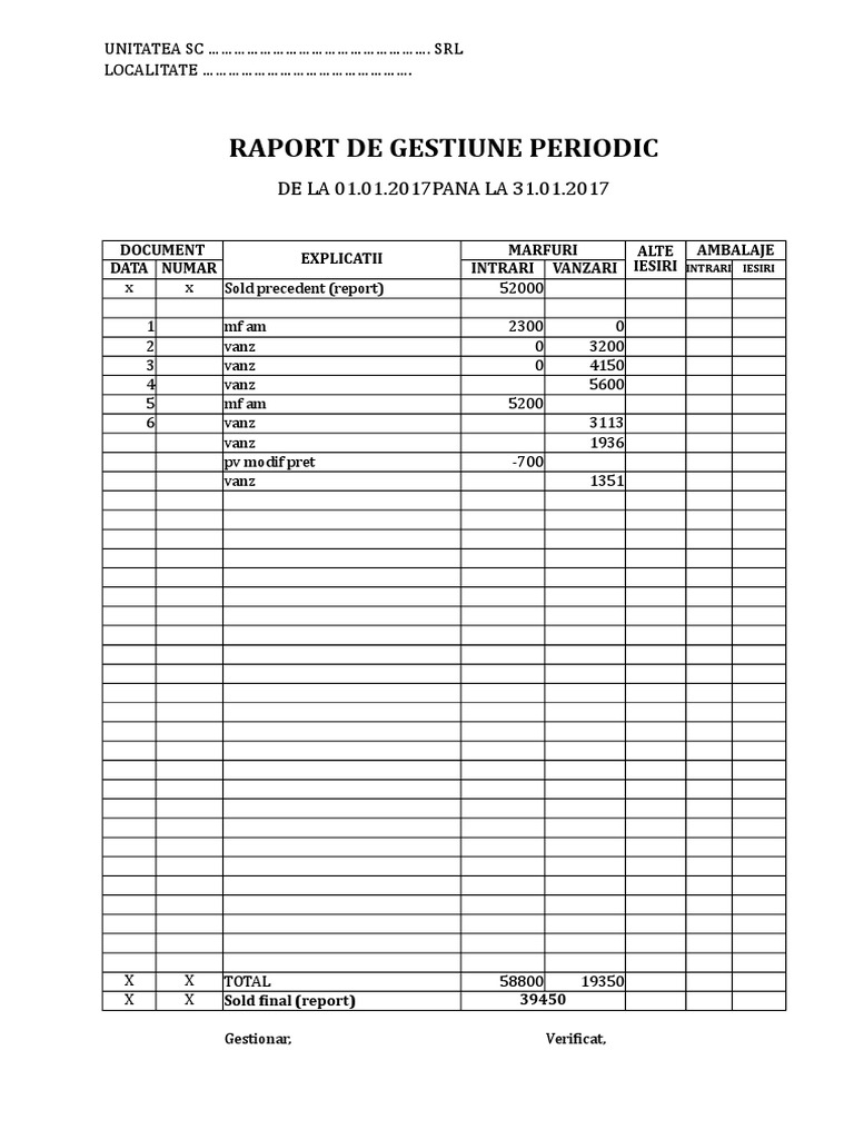 Pe baza acestor sume se calculeaza soldul … Va rog sa ma ajutati.am deschis un mic magazin si incerc sa imi rezolv singura partea cu contabila.si nu reusesc să gasesc nicăieri un exemplu.toate sunt pentru calculator.va multumesc. Documentele pe baza carora se intocmeste raportul de gestiune pot fi: